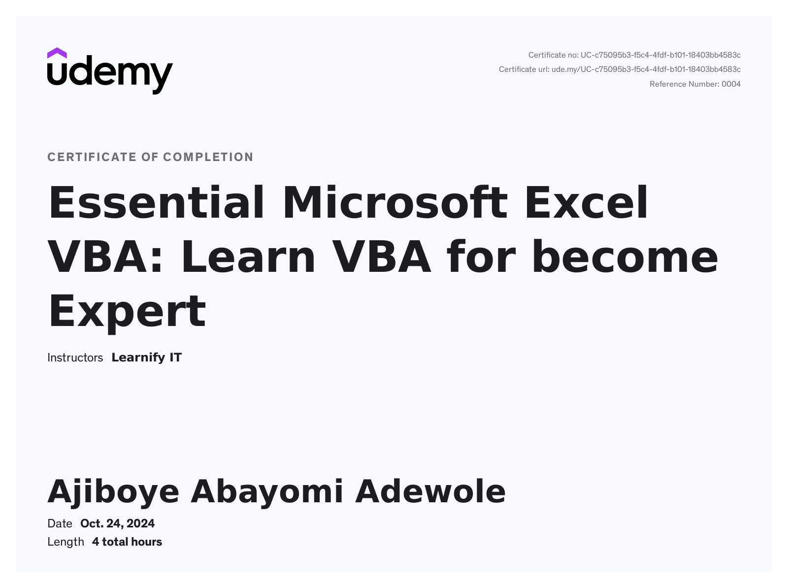 Applied marketing analytics and retail management techniques using Excel. Issued by Udemy. Expires/Issued: October 2025.